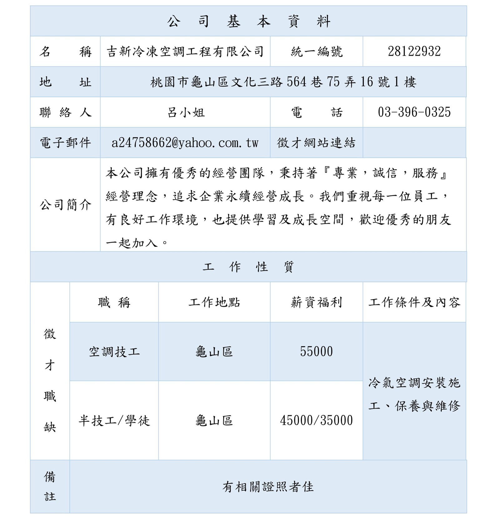 【徵才】吉新冷凍空調工程有限公司徵才資訊